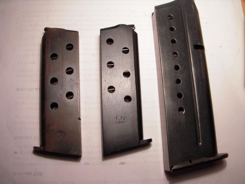El cargador pequeño es de una F.N Browning modelo 1900 cal 7.65mm, la conocida como la mataduques, te dejo un enlace para que puedes leer algo de esa pistola y su historia de por que la llaman "mataduques".