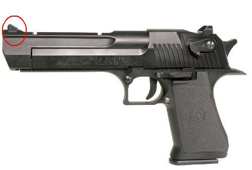 Tengo una réplica de la desert eagle 50AE de la marca tokyo marui y he perdido una pieza que compone el punto de mira abierto que trae de serie esta pistola, os pongo una foto señalando la pieza que he perdido.