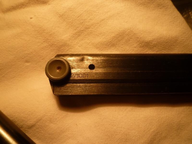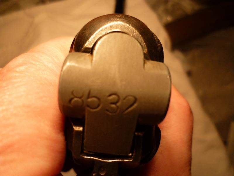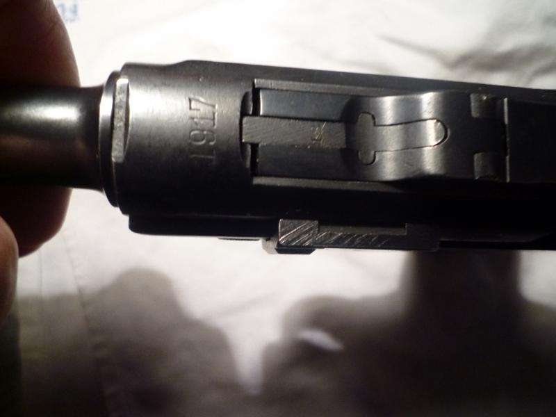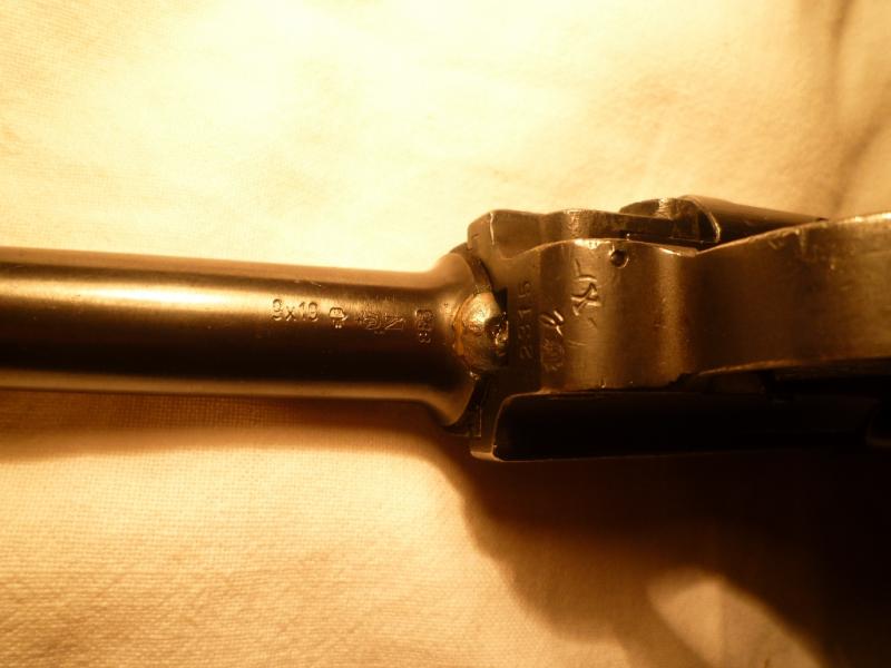 -- La parte de la empuñadura puede ser de una DWM fabricada durante la I Guerra Mundial, al igual que la "horquilla" superior (no me atrevo a llamarla corredera, porque en realidad no se mueve como en las de sistema Colt), y además presenta bajo el guardamonte o junto a el varias marcas interesantes que te hablan de la historia del arma. Puedes ver una especie de X, que significa que en algún momento de su servicio fué capturada por el ejercito ruso, y junto a ella otra marca que la identifica como una de las destinadas a la VolksPolizei en la extinta R.D.A, lo cual corrobora el dato anterior de la captura.