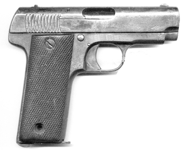 Olvidaba algo en cuanto al tema del "cerrojo". Creo que esta pistola funciona por retroceso de masas simple y como casi todas las de su época de calibre relativamente pequeño y hasta el 9 corto no tiene recámara acerrojada. Me parece que las recámaras con bloqueo empiezan a ser imprescindibles -por la potencia del proyectil- a partir de calibre 9mm (parabelum o largo).