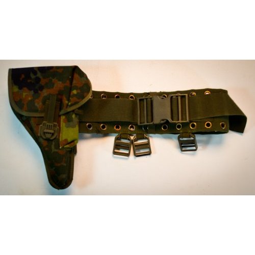 Por lo que he podido ver, creo que no te falta ninguna pieza. Es la funda Flecktarn para P-38 con "webbing adapter" del Bundeswehr y creo que se sujeta al ceñidor simplemente encajando los salientes del adaptador del dorso de la funda en los agujeros del ceñidor (los que harían más sujeción en el ceñidor y aguantarían realmente el peso de la funda serían los de arriba que creo observar que tienen la misma forma que un alcayate de colgar cuadros. Los de abajo entrarían a presión en los agujeros correspondientes de la parte baja del ceñidor.