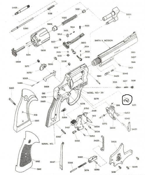 Te envio el despiece del revolver, si no es el mismo, todos los SyW son iguales, el problema es la pieza marcada 5015, que es el freno del tambor. Dicha pieza, está desgastada, o tiene poca presion para sujetar el tambor en la ranura correspondiente y a consecuencia del disparo, se gira el tambor saliendose de la misma ranura dicha antes, si sabas desmontarlo y ver lo que pasa, lo puedes hacer tu mismi, pero es algo complicadillo, lo mejor es que lo lleves a un armero, te lo mire, es sencillo para él, yo mismo he reparado esta averia en algun revolver, pero hay que saber.