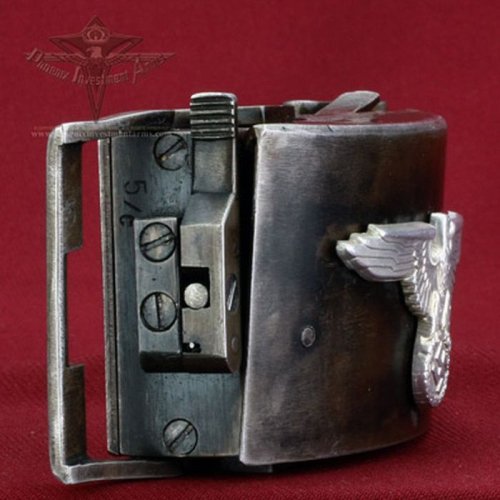Sin ánimo de ofender, sobre que el arma de la "hebilla" funcione o no, no opino ya que podría ser un arma real, pero que es una falsificación inventada de postguerra seguro, nunca he visto una en una foto de época ni en ningún libro, los codigos de fabricante son inventados 100% y encima es hortera a más no poder y como tantas falsificaciones de fantasía cuanto más nazi se vea mejor. Lo raro es que aparte de ponerle un aguila de gorra de las SS no tenga una figurita de hitler que cuando levanta el brazo dispara.