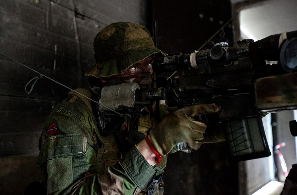 tiradores noruegos posicionandoce dentro de una estructura o edificio. ademas de las zapatillas deportivas de suela amarilla lo que nos dice que se trata de un entranamiento, podemos apreciar elementos del oficio y lindos "juguetes" de H&K