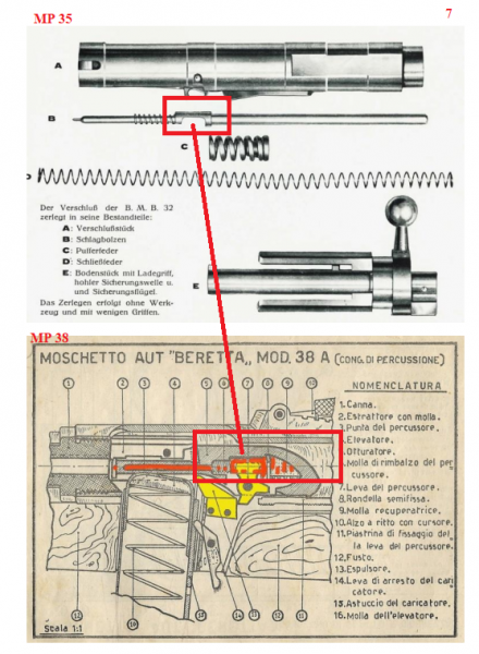 La camisa de refrigeración que envuelve en el cañón que ambas armas coincide, al estar ventilada con ranuras longitudinales tanto en el alemán como en el primer modelo del italiano, luego sustituido por orificios circulares. También coinciden en el freno de boca o compensador que en el modelo de serie del MP38 ya se parece más al MP 35. Otro punto de coincidencia es la empuñadura de la culata con forma muy semejante en ambas armas e incluso diría que tienen la misma forma e inclinación, según aprecio en las fotos.