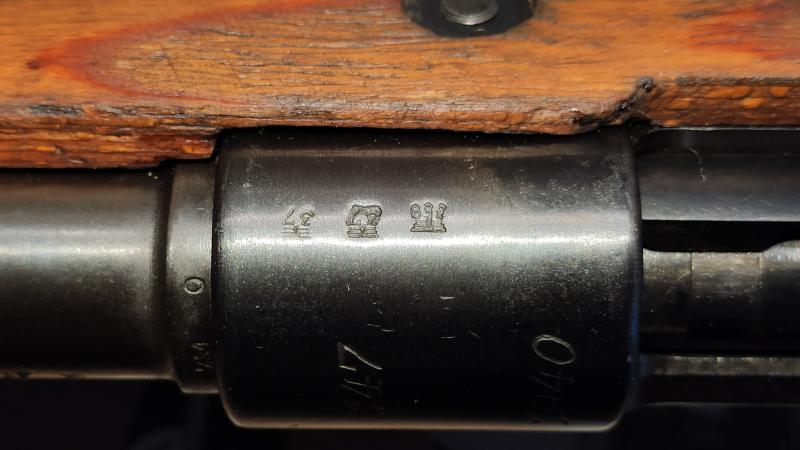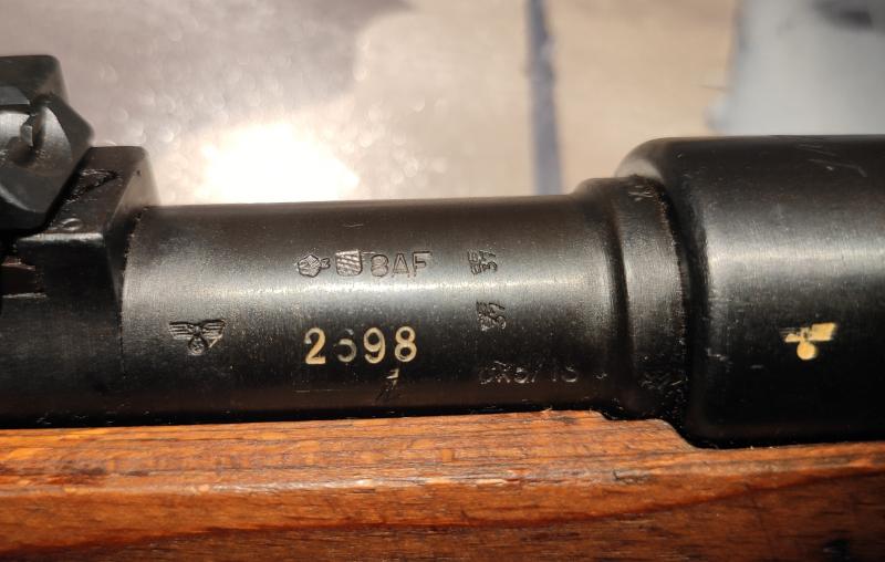 Por lo que sé hasta ahora es un rifle fabricado en 1940 en las fábricas de J. P. Sauer und Sohn (Suhl, Alemania), que tenían el código 147 entre 1939 y 1940. Lleva 2 aguilas del tercer reich y algunas aguilas de weinar con lo que parece una "N" debajo que no se lo que significa. El calibre 8x57IS, un "8AF" y la "i". Además lleva el otro marcaje que suelen llevar las armas de esa época: 3 sobre la recamara con los códigos 359,37,37, 3 debajo del alza con los códigos 359,359,359, uno en la retenida del cerrojo con lo que parece un 4 junto a una K y un 93, y 2 sobre el cañon con 37 y 37.