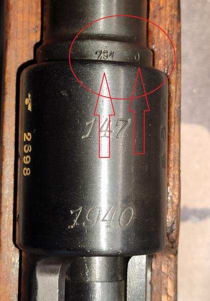 Por último, encontré 2 marcajes más que se me habían pasado por alto. El primero está en el cañón en el escalón encima del código 147 sobre la recámara, y pone 7,91, entiendo que será el diámetro del cañón, ya que usa puntas de 7,92mm y mas a su derecha hay un 0. El segundo marcaje está también en el escalón entre recamara y cañón, a la derecha del calibre 8x57IS y ni idea de lo que es.