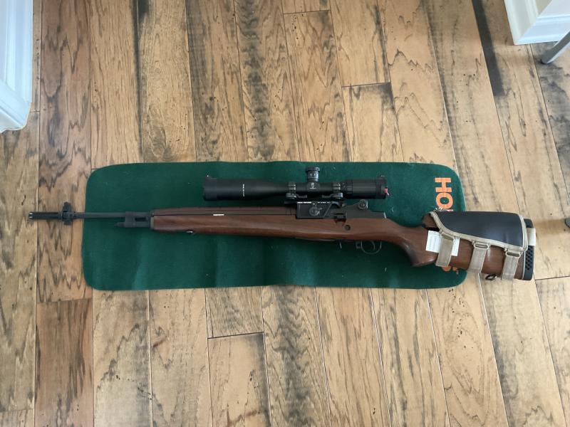 Hoy puedo confirmar que es Springfield Arm M1A en calibre .307 w, todo de madera, con cargadores de 20 pero limitado a 2 cartuchos.