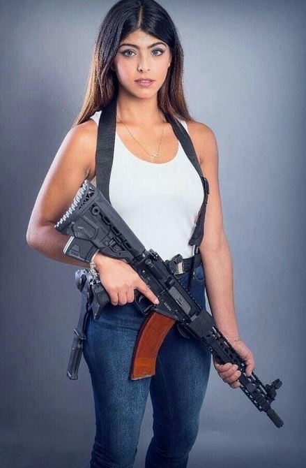 Yo diria que la rubia lleva una pistola smith & wesson m&p9 y un hk g3 o un clon sabre defence xr41, pero el "mirad bien" me hace pensar que hay trampa.