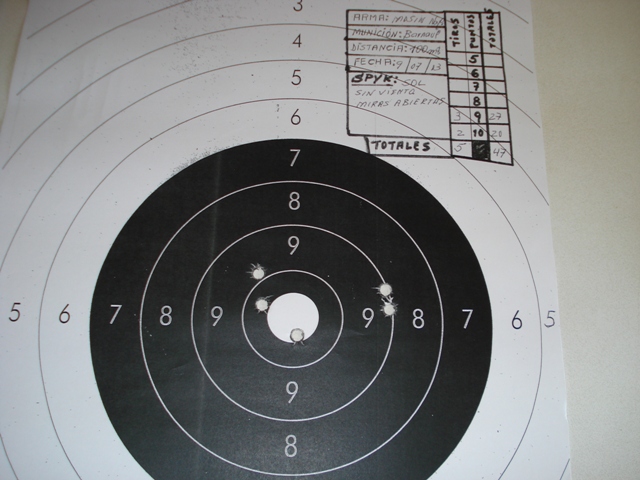 Con las Lapua, además de ser el retroceso suave (lógico al ser el proyectil más bien liviano), la precisión era bastante satisfactoria: una agrupación ovalada de unos 15 centímetros en el eje horizontal y unos 20 en el vertical.