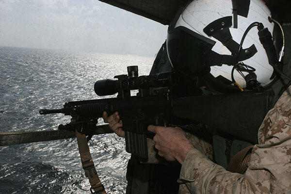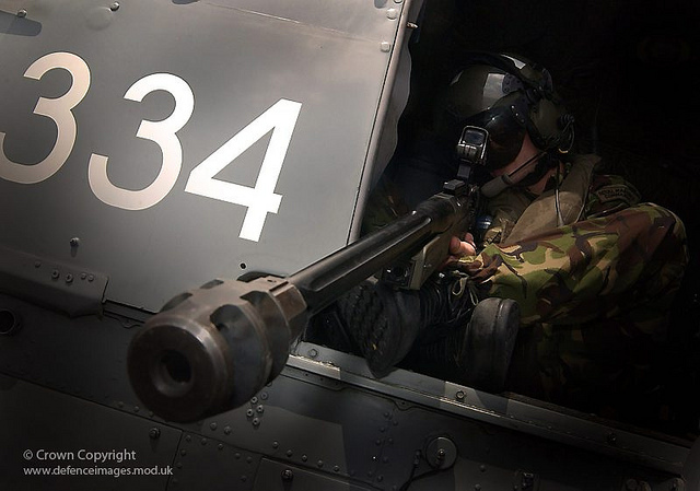 bien, en alta mar lejos de una superficie estable, es muy bueno tener un pájaro en orbita con un buen tirador arriba, es cierto que los helicópteros vibran se sacuden y el ruido es infernal, personalmente he volado, descendido en cuerdas y demás cosas de helicópteros Puma, Dauphin y UH 1. Sacando el ultimo los otros permiten una plataforma de tiro aceptable, igualmente el muchachón de abajo ya tendrá otro problema mas en que pensar