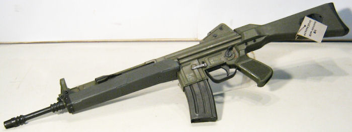 Pues los primeros prototipos eran en 4´56 y 5´56. Además de las selecciones habituales (semiautomático, seguro, automático) incluía una cuarta opción de tiro limitado a 3 ráfagas y no aceptaban los cargadores de M-16 porque su brocal era corto. El alza dera de tipo tambor, de dos piezas. Una característica muy peculiar es que le guardamonte era abatible para poder disparar mejor con guantes. Y en efecto era de color negro, con el guardamanos y culata de color verde.