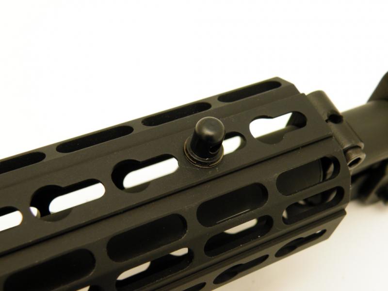 Lleva, a parte de agujeros para refrigeración los agujeros del sistema "key-lock" (¿se llama así?) que permite poner carriles pica adicionales o directamente los accesorios. Lo bueno es que si no necesitas los carriles o los accesorios lo desmontas todo y lo único que queda es un bonito agujero que contribuye a la refrigeración. Me parece una buena solución para evitar esos fusiles que se ven de vez en cuando llenos de carriles sin usar por todas partes que, a parte de peso y de ser muy poco ergonómicos, son feos de cojones