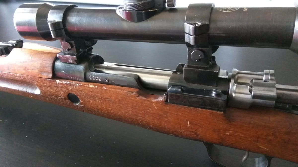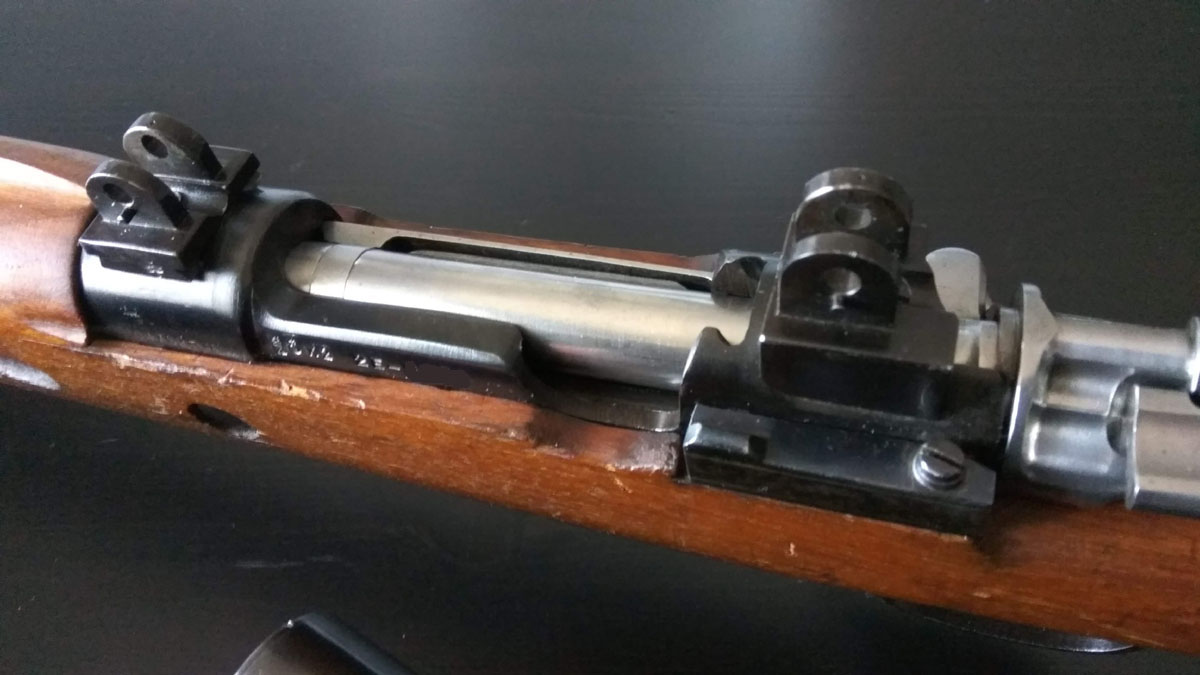 Algunos detalles. En las fotos se puede observar el sistema de montaje del tipo 1, una vez fijado el visor, el conjunto queda firmemente sujeto, sin holguras que puedan alterar la precisión. Mediante dos pasadores roscados se aseguran anillas y visor a las bases, esta fijación tiene muy poca tolerancia, las piezas mecanizadas en buen acero encajan a la perfección. Las anillas, los pasadores e incluso los tornillos van numerados con los últimos dígitos del arma.