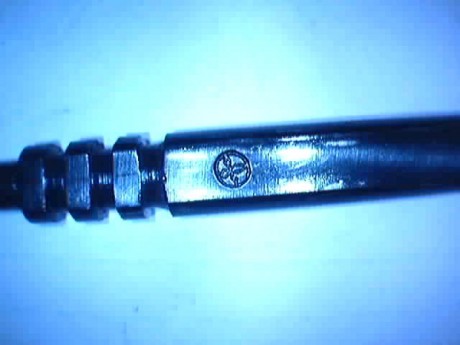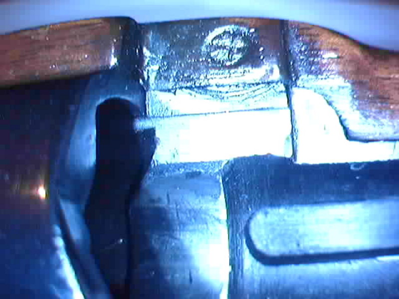 Fotos tomadas con la webcam, con mala calidad pero se ven los marcajes, he encontrado uno que pueden ser los cañones cruzados de artillería en la madera, justo donde apoya la maneta del cierre.