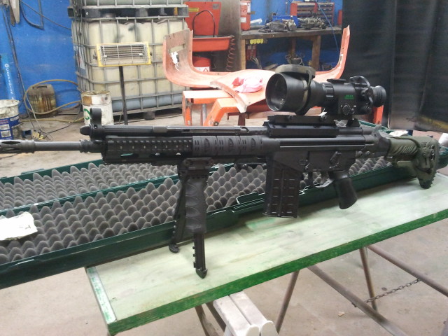 Y luego, aunque a título particular y porque mis manos no lo agarran bien, después de todo lo que has invertido ahí, creo que te quedaría mejor un guardamanos de FAB Defense, para mi gusto el mejor de los que he probado, más estrecho, macizo y que cubre la parte delantera del brocal del cargador, en vez de ese UTG/Leapers que has puesto. Eso si, como he dicho, a título individual, tengo los dos y me gusta más el FAB.