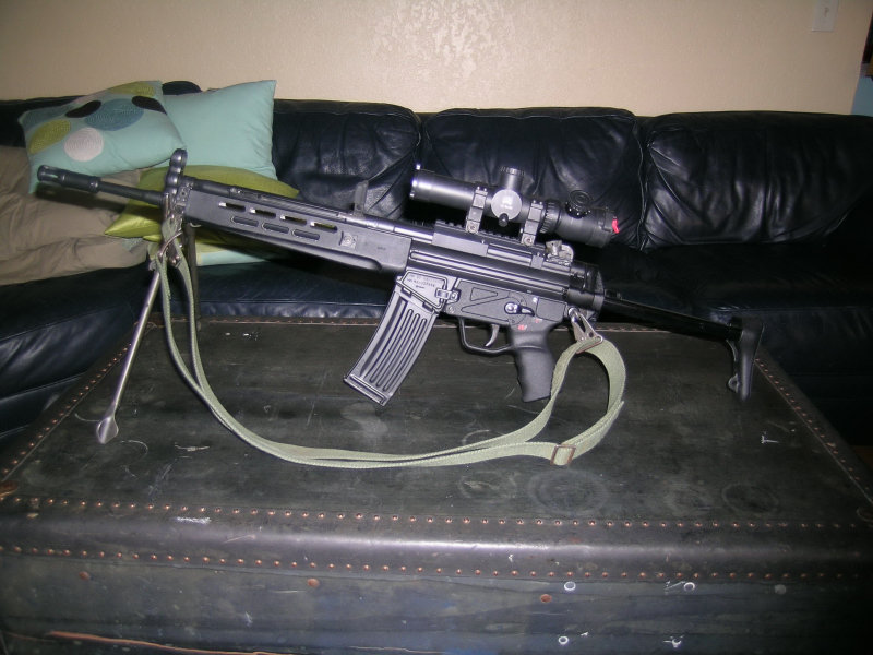Fusil G3 con un culata Magpul ajustable, Schmidt & Bender 1,5-6x42 , FAB guardamano RIS, bípode Harris y un supresor de BR Reflex.