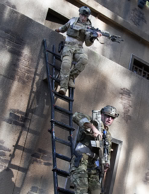 Fuerzas especiales estadounidenses “compitiendo”, obviamente tiro de precisión urbana, que parecen urbes de “Oriente”. Básicamente 7.62x51 semiautomático y demás complementos como designador laser. Escalera para subir tirar bajar y uir. Y equipos como cascos (algo no muy sniper) chalecos tácticos con disposición en el vientre pecho, nada de arrastrarse