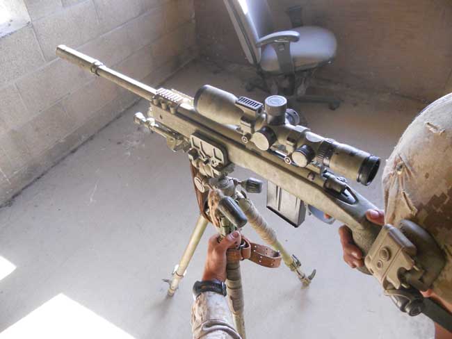 dentro de una edificación con trípode, posición que hace difícil su deteccion. Sumado a un arma semiautomatica se puede disparar varias veces y retrasar el avance. El silenciador hace al tirador casi indetectable