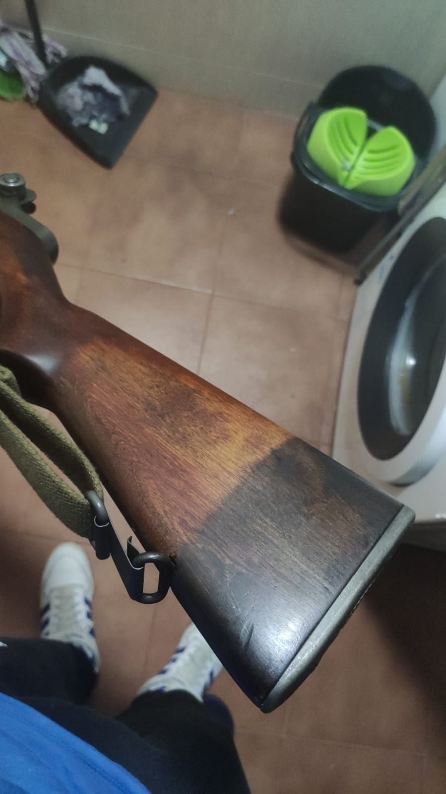 El problema es que el propietario le puso un elevador de mejillas en la culata, y después de décadas pues cuando lo quité había una decoloración muy notable entre zonas, de todas formas la madera ha quedado mucho mejor de lo que estaba además de hidratada y sellada. El misticismo del garand es porque ganó la 2ww, es un arma increíble.