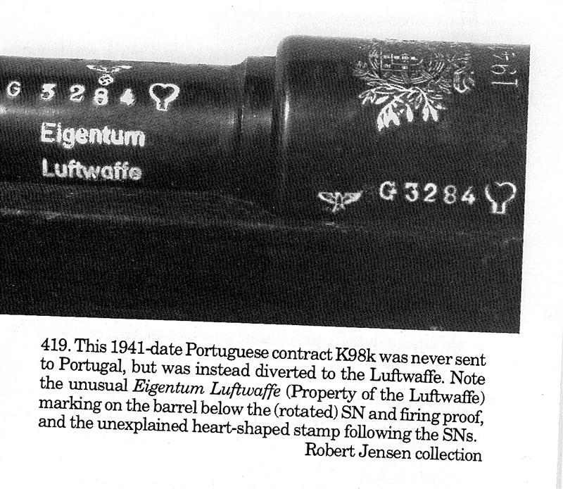 Cuando los mauser portugueses tienen marcadas la "H" o la "L", es porque pertenecen a alguno de los lotes que no fueron a portugal y fueron reutilizados por el ejercito o la fuerza aerea alemana, en algunas ocasiones tambien tienen en el cañon un marcaje de propiedad de la luftwaffe "eigentum luftwaffe" o algo por el estilo, ahora no recuerdo como se escribe.