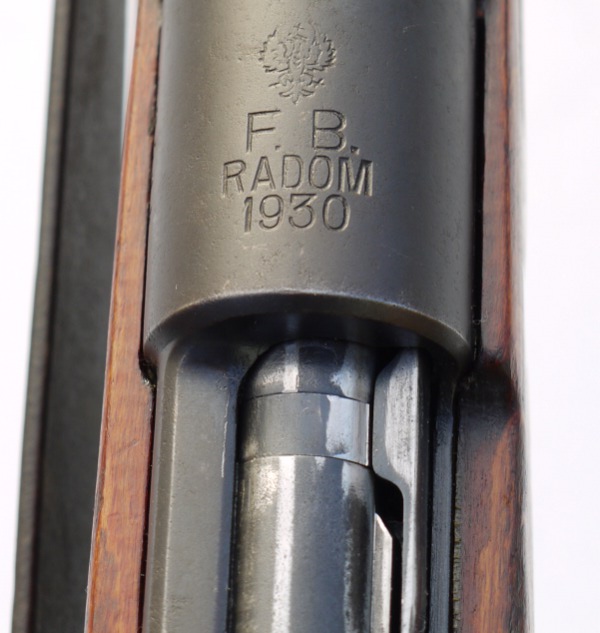 En el lateral izquierdo de la ventana de expulsión de vainas tiene grabado K98; sobre la recamara hay un aguila y bajo la misma las letras F.B., debajo RADOM y bajo esto 1931, tiene el cañon roscado hasta el punto de mira y agujeros sobre el puente como de haber tenido instaladas las bases de un visor, no tiene ningún tipo de numeración ni punzones de banco de pruebas, tampoco el calibre.