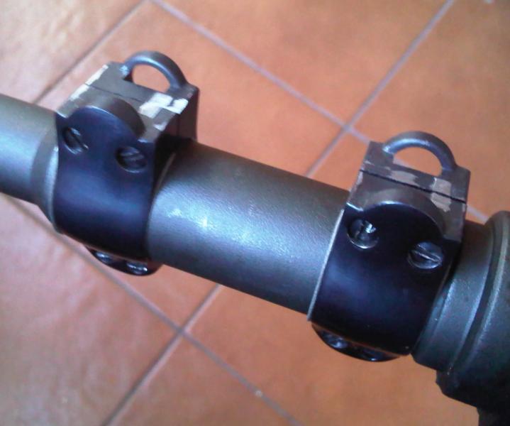 En relación con la pregunta sobre las bases, son unas simples anillas de 1" (el cañón mide 25 mm de diámetro), eso sí son de acero (no aluminio), yo utilicé unas que adquirí a precio de saldo en Ebay (Ruger son buenas porque son para carril de 11 mm, y al guardamanos hay que hacerle ventanas pequeñas).