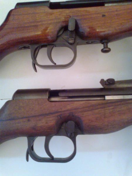 El primero es un Coruña del 9 largo el de abajo es uno hecho en valencia o Cataluña durante la GCE en calibre 9 Parabellum, las unicas diferencias ,aparte de una pequeña variacion enlas dimensiones de la madera, consiste en el mecanismo de selector de tiro, la palanca es igual,pero el mecanismo no, no se si apreciara una pequeña media luna a la izquierda del selector de tiro,y no posee seguro de transporte,