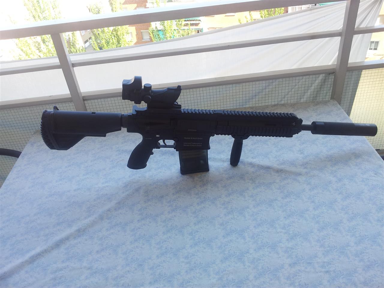 Pues aqui les dejo unas fotos de mi última adquisición airsoftoril un HK417 al que le he puesto un visor ACOG4x + Micro Red Dot , Grip Vertical y silenciador. A ver que les parece.