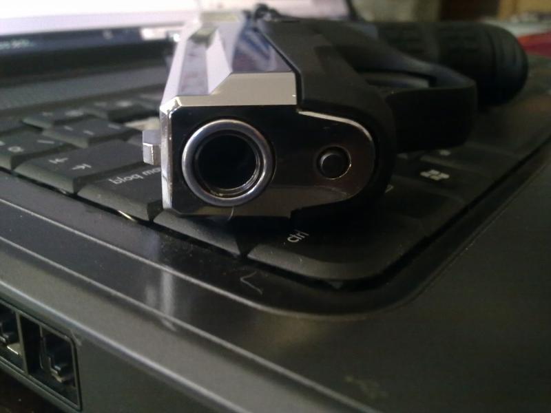 Segundo, con un mechero de llama potente, o mediana al menos, colocar el arma con la retenida atrás o desmontada boca abajo y "ahumar" durante unos 45 segundos bien la boca del cañón. Eso deja "el pincho" de un negro mate muy denso, que no refleja la luz, por lo que se hace casi invisible. Luego limpiais con un kleenex el resto de hollín y listo.