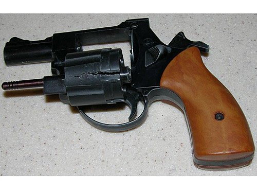 Hoy he visto en una revista un anuncio de venta de un revolver de fogueo,que ponía algo así como "dispara munición de fogueo pero se puede tornear y disparar munición real"