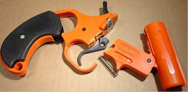 -la pistola está pensada para una determinada presión, y por eso se fabrica en plástico o en aleación de aluminio blanda ("zamac"), así que si alguien recorta un cartucho de escopeta y lo dispara con esta pistola, estallará en mil pedazos, algunos de los cuales serán de la mano del "listo".