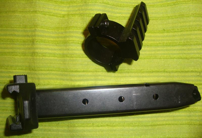 Se trata de un cargador para la zoraki 917 con una base israelí picatinny para poner como pistolete frontal en el propio rail que integra la zoraki 917, amen de que lleva una anilla para acoplar una linterna tactica en la base israelí picatinny acoplada por que dicha anilla integra un rail picatinny.