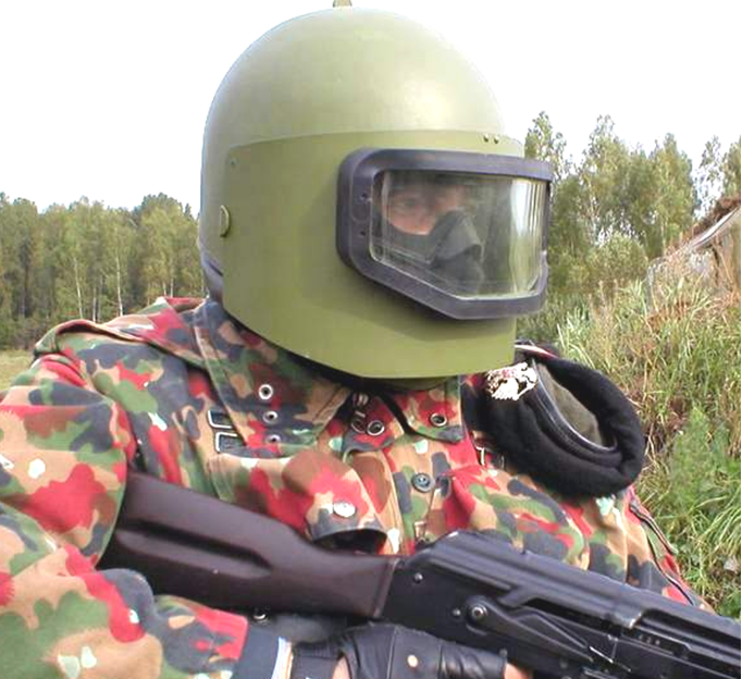 es el casco Maska-1 y dicen que aguanta un el impacto de un 7,62 , tiene otra versión que tiene una visera con una pequeña abertura para dar mayor protección , por lo visto estos son cascos solo usados en intervenciones puntuales pues la tropas no los pueden llevar de continuo por su alto peso provoca problemas cervicales si se usan de continuo.