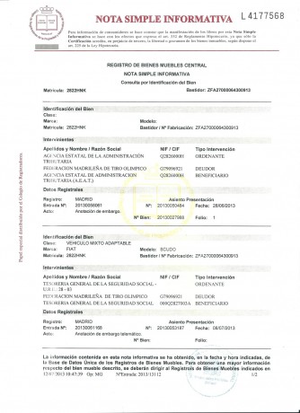 Para poner algo más de luz en el asunto, lo que el federado desconoce es que el 28 de junio de 2013 la Agencia Estatal de la Administración Tributaria decretó el EMBARGÓ la furgoneta de la Federación, una Fiat Scudo adquirida el año anterior. Con este embargo el asunto ya pintaba mal, y aun empeoró cuando diez días más tarde, el 8 de julio, UN SEGUNDO EMBARGO recayó sobre la misma furgoneta, aunque en esta ocasión ordenado por la Tesorería General de la Seguridad Social. Curiosamente, dos días después aparece el Sr. Sutil reclamando una derrama a todos los federados con la que, según nuestros directivos, se ha llegado a recaudar 176.000 €.