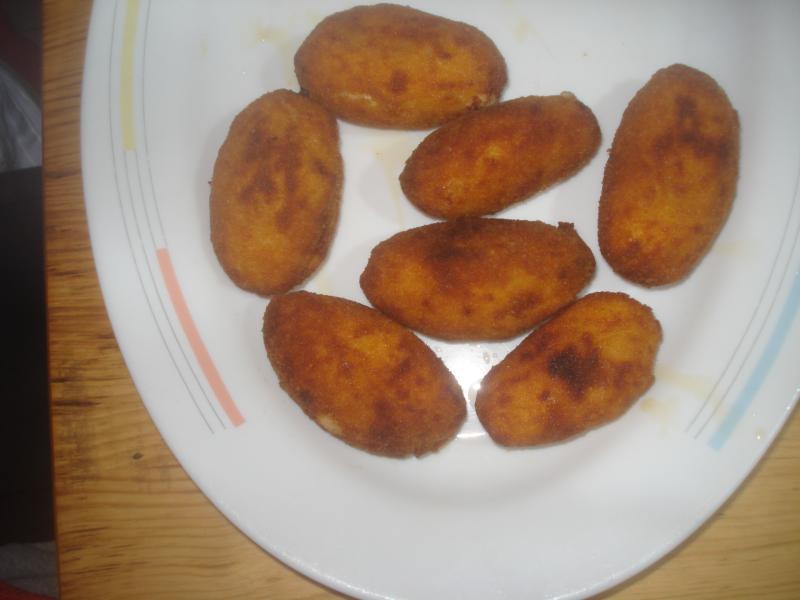 Acelgas hervidas en trocitos y croquetas de ave, jamón y huevo duro con patatas fritas. :wink: