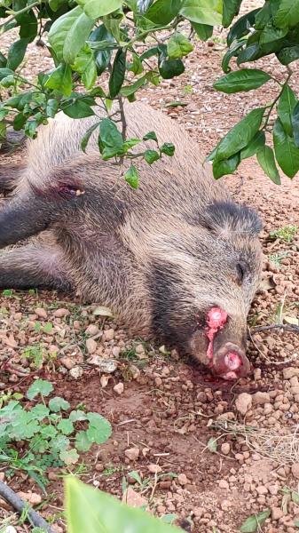 me la ha enviado mi cuñado . Es como ven un jabalí muerto a unos metros de la cuneta , que ha visto mientras iba con la bicicleta y que ha parado para hacerla. El piensa que ha sido atropellado aunque e mi pregunta no había restos de coche vidrios o algo. Nada . Le pregunto pir heridas y lo que se sangre en el morro, y en la pata lo que parece un corte o una fractura abierta. No le ha dado la vuelta. Me dice que pesaría mas de 50kg. y que no sabe di era macho o hembra. Si ha muerto por accidente me alegro que el no se vean restos de coche , es carretera de montaña y pasan pocos camiones. Mañana hoy no he podido iré a ver si lo encuentro Supongo que si lo hago tendré que llamar a la G.C. para preguntar que hacer . Si fuera macho y tiene navajas me las quedaré. Si hubiera podido ir hoy lo habría traído a casa , despellejado, y llevado al veterinario del CEU el hígado y los pulmones y si no tenía triquinosis repartirlo entre la familia. Pero es lo que hay . Mañana les cuento.