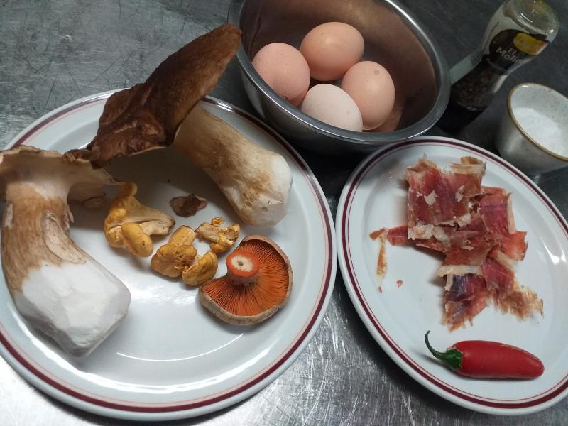 Aquí un puñado de setas que recogí del suelo por el monte, unos huevos que también recogí, del gallinero y un chile jalapeño que ídem, del invernadero. El jamón vino de extremadura.
