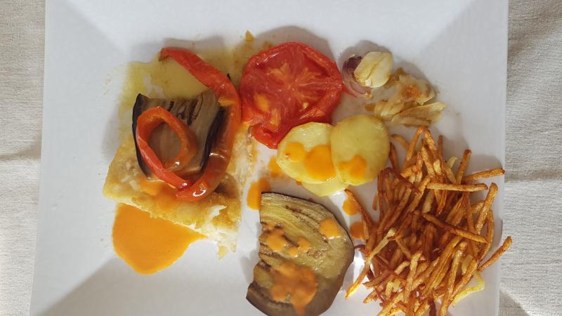 Con tomate, pimientos rojos, berenjenas, patata cocida y patatas
