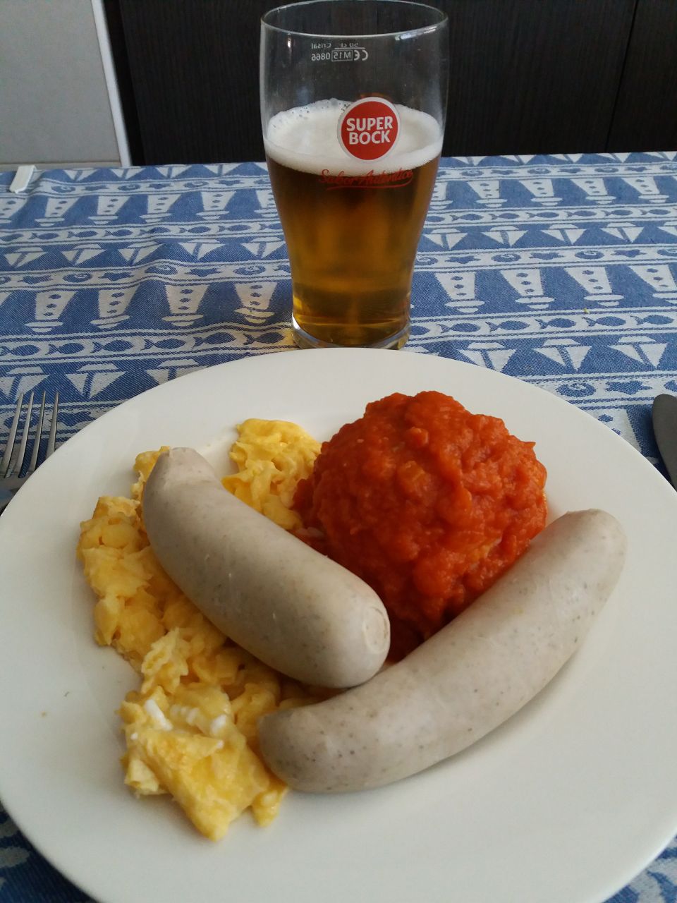 Arroz blanco con tomate, salchichas Bratwurts y huevos revueltos. Cerveza a gusto.