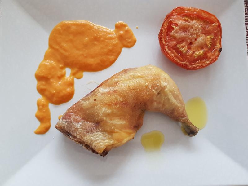 Hoy, muslo y contra muslo de pollo de corral con guarnición de tomate en salsa