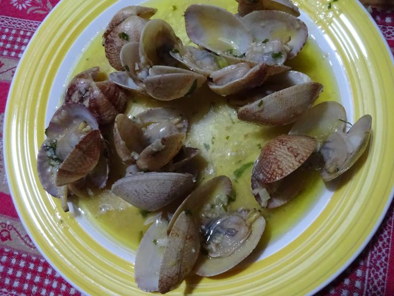Almejas en salsa verde y medallones de congrio frito a la romana, las fotos luego.