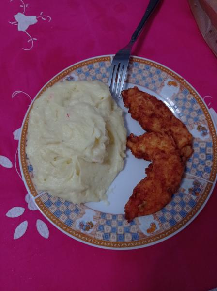 Cena de anoche: solomillos de pollo con puré de patata, cortesía de mi compañero de trabajo