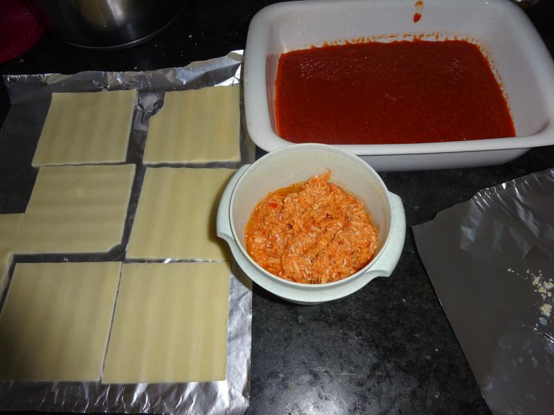 Ingredientes: LOs canelones en bruto, la farsa de bomnito y la fuentye con cama de tomate frito casero.