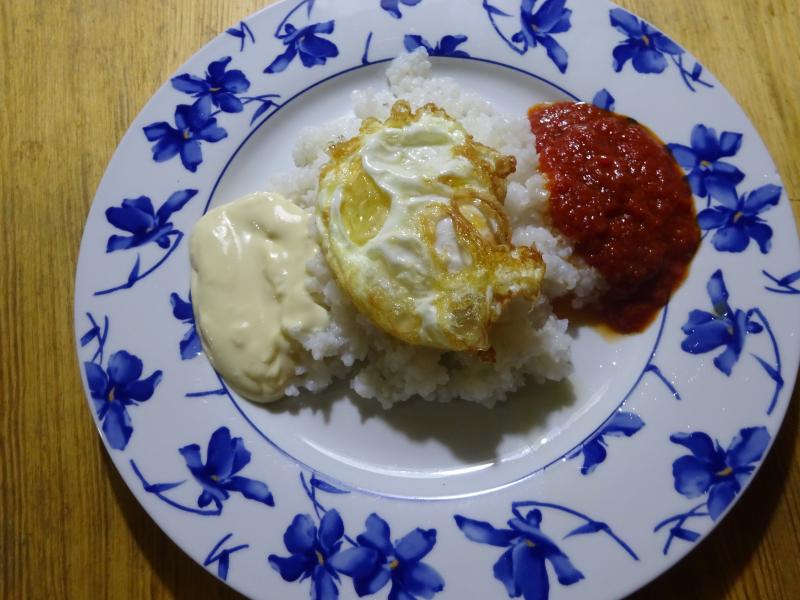 Para cenar arroz blanco, huevo frito con puntillas, tomate frito y mayonesa de casa.