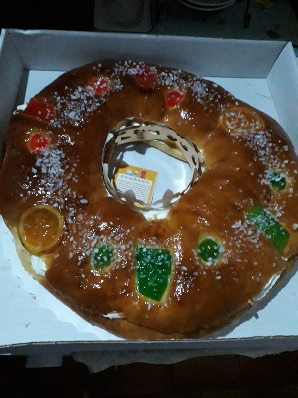 Se me olvidó el Roscón de Reyes de unos 40 cm. de diámetro que lo hace un pastelero de mi pueblo de manera artesana y relleno de nata autentica.