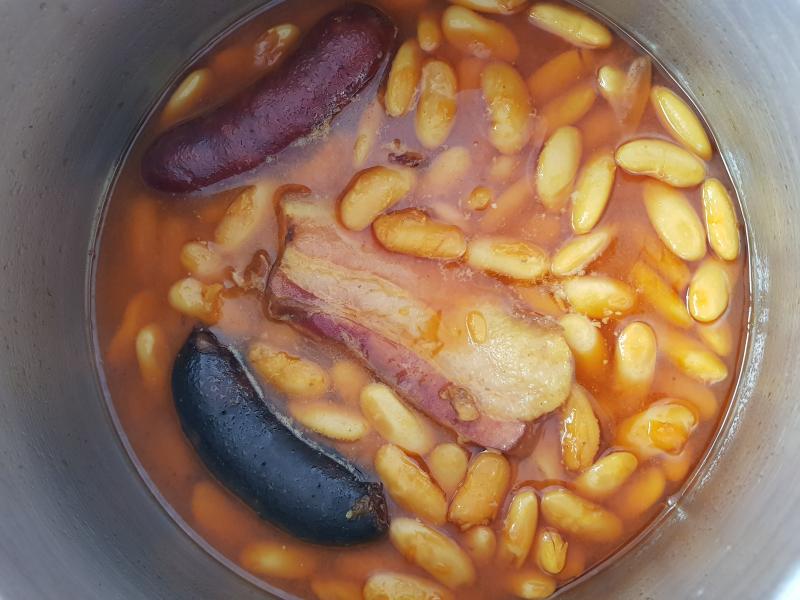 Esta esta preparada con panceta, morcilla, chorizo y como no, alubias de la granja. Las alubias a remojar el día antes, cambiar agua y ponerlas a hervir, cuando esto sucede se incorpora el compango previamente pinchada la morcilla y chorizo para que no se rompa la piel y la estropee. Asustarlas de vez en cuando con agua con el fin de reponerla y que la piel de la alubia no se suelte, se mueve la cazuela de vez en cuando para que suelte harina la alubia y después de dos o tres horas haciendo esto se acabó. Es un plato muy sencillo, solo exige prestarle atención