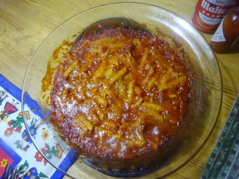 Macarrones con chorizo de Iberia gratinados con queso Emmental.