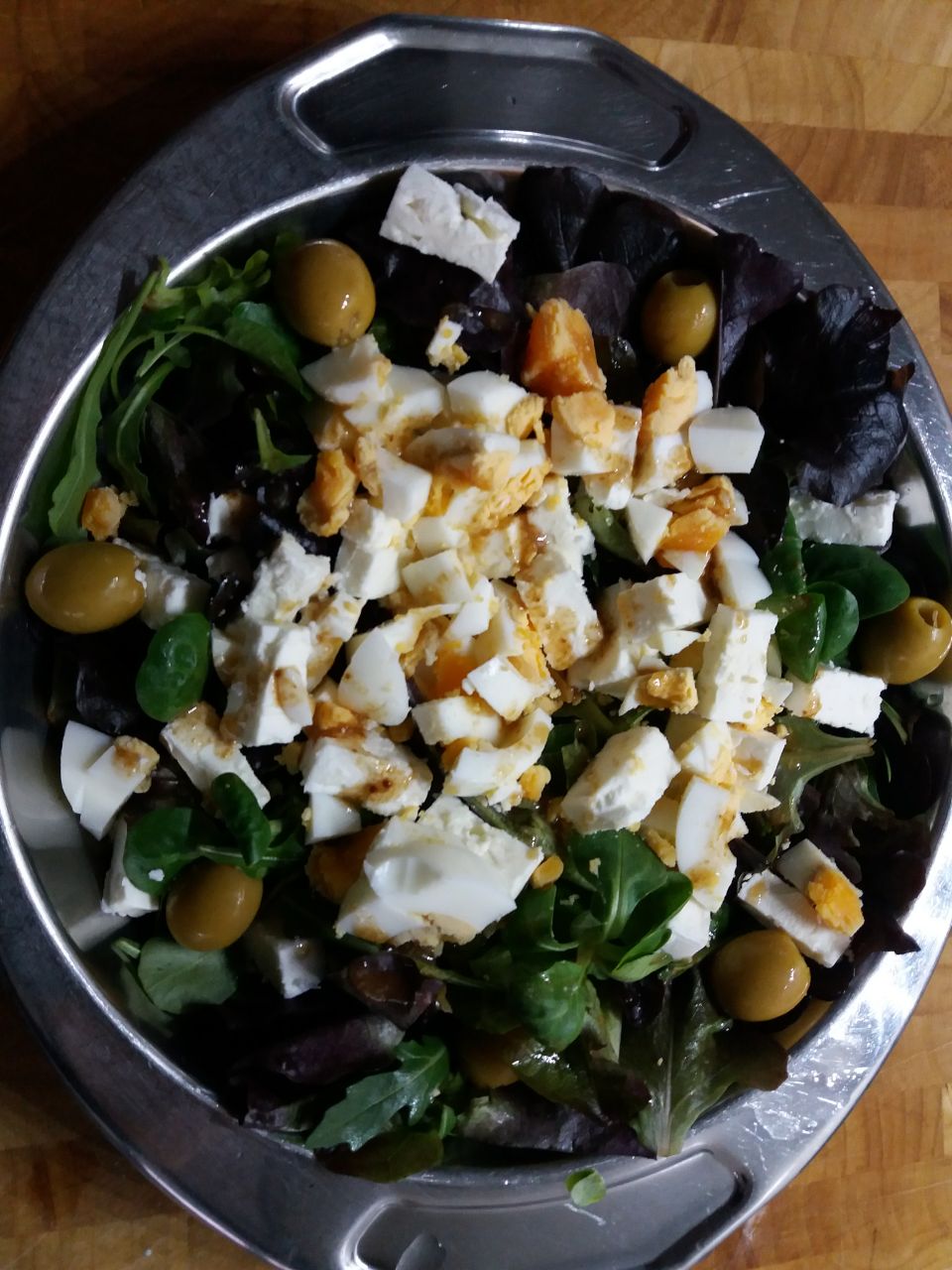 Ensalada de brotes tiernos con lo que quedó del queso Feta, olivas y huevo duro.