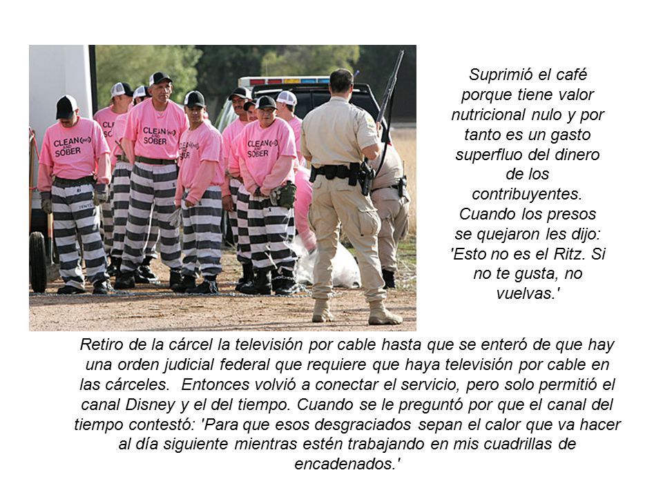 Tal como sucedía en el condado de Maricopa del estado de Arizona durante el "mandato" del Sheriff Joe Arpaio por donde los delincuentes no pasaban ni por equivocación y en donde la cárcel no era un SPA ni lugar de retiro espiritual tal como en España, allí no había ni cafe ni postre ni aire acondicionado y en algunos pabellones ni si quiera paredes.
